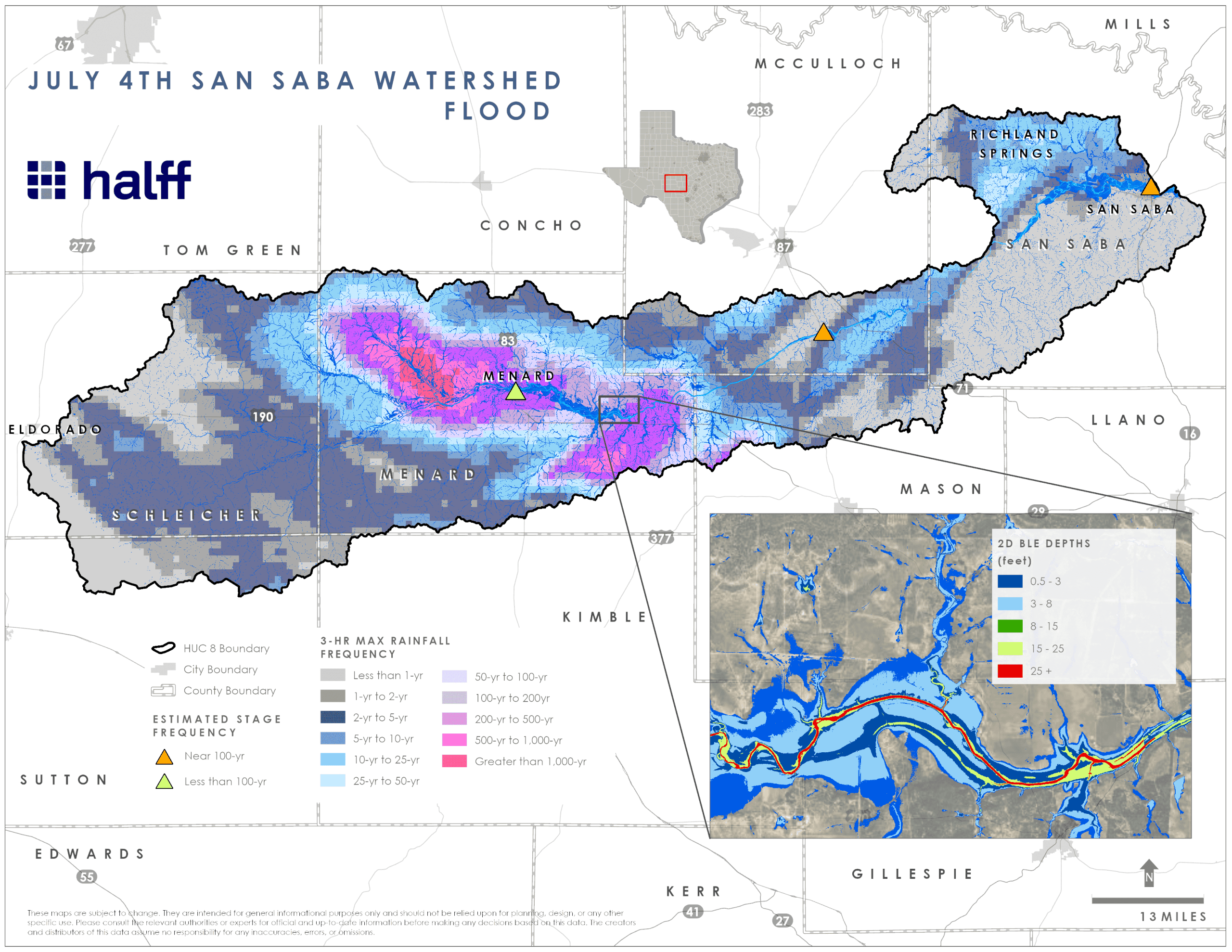 A significant portion of the San Saba watershed in the Menard area experienced three-hour to 24-hour rainfall total ranging from the 100-year to greater than the 1,000-year return period events. Rainfall data shows that Menard experienced the most intense three-hour rainfall frequencies, while the highest 12- and 24-hour rainfall frequencies occurred south of the San Saba River near the Menard and Mason County boundary.